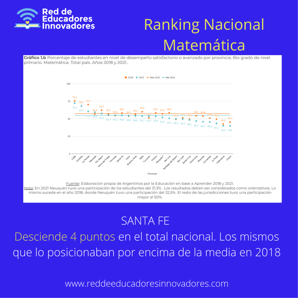 La posición relativa de Santa Fe también se ve afectada negativamente. Si bien en Lengua está levemente por debajo de la media nacional, cuando lo comparamos con 2018,se observa una caída del 19,3% . En Matemática, cayó 4 puntos por debajo de la media nacional, mientras que esa misma diferencia en 2018 la ubicaba por encima de la misma.