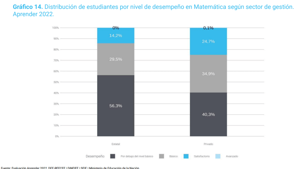 La mitad de los chicos de gestión estatal están por debajo del nivel de aprobación (49.5%), mientras que en privada son el 35.4%. Nuevamente la brecha entre ambas gestiones es de 14 puntos. La caída de la calidad de los aprendizajes no deja a nadie afuera.