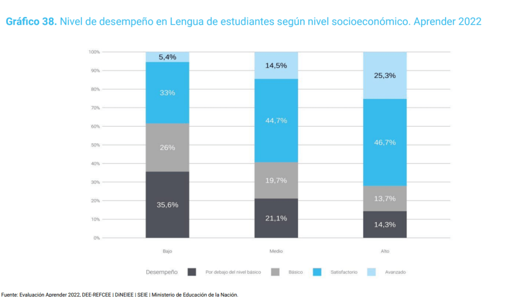 Casi 7 de cada 10 chicos del nivel más bajo, no tiene los conocimientos básicos en Lengua, mientras que en el sector de mejores condiciones socioeconómicas son 3 de cada 10 (2.8%).